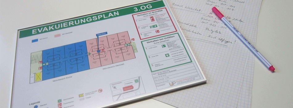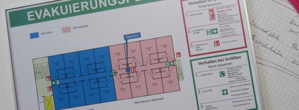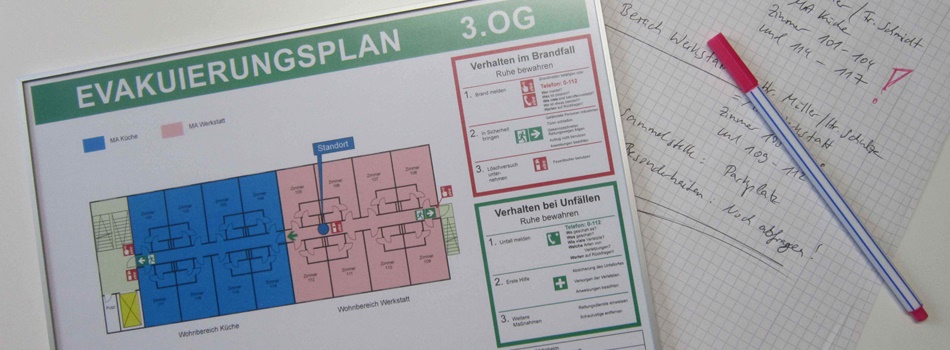 Evakuierungspläne werden als internes Hilfsmittel genutzt, um festzulegen, welche Gebäudebereiche von bestimmten Mitarbeitern im Notfall geräumt werden sollen. Dies ist z.B. in Einrichtungen für Menschen mit Behinderungen hilfreich. In diesen Einrichtungen können möglicherweise nicht alle Personen eigenständig flüchten und benötigen Hilfe. Dazu werden die Gebäudebereiche farblich markiert und evtl. mit zusätzlichen Anmerkungen versehen. So ist eine schnelle Übersicht gewährleistet.